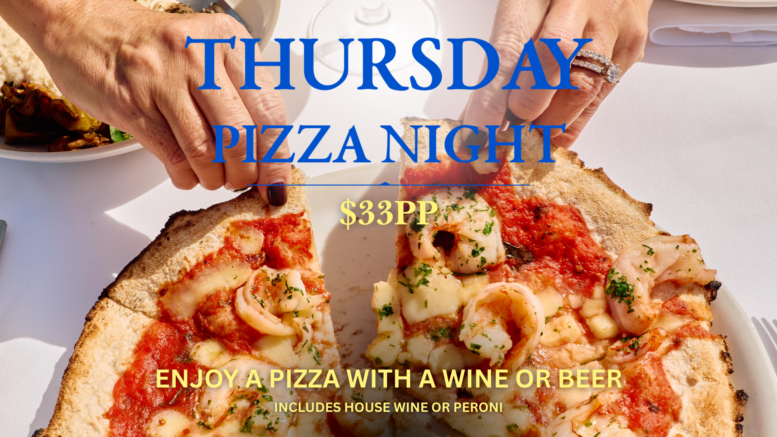 From Thu 16 April, enjoy a relaxed midweek moment by the water with a pizza of your choice and a house wine or Peroni for $33pp. Bookings recommended.